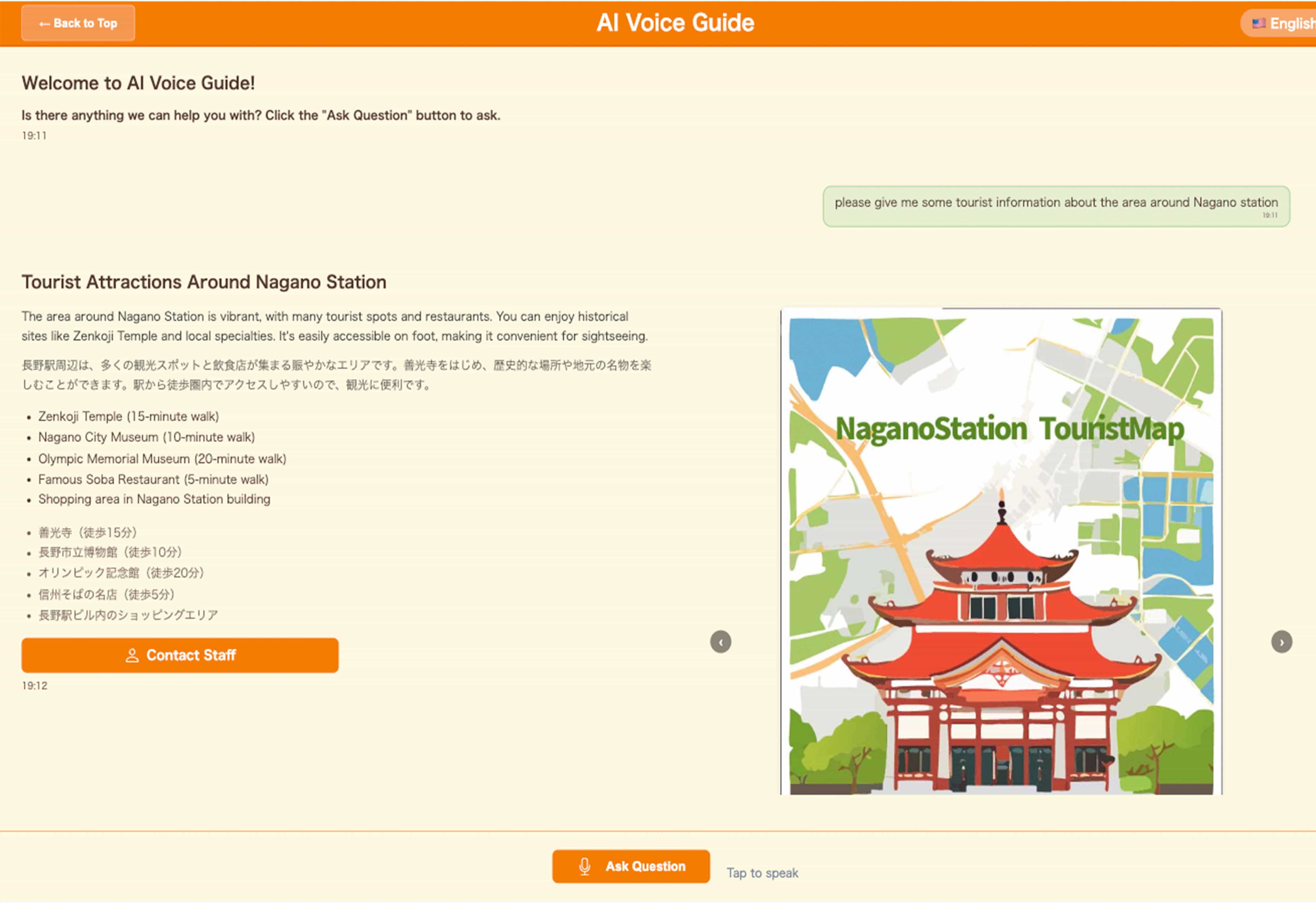 本システムは、Webブラウザ上で動作するAI音声案内システムです。 利用者が話しかけた内容をAIが理解し、関連する情報を文字と画像で画面に表示します。 また、音声認識・翻訳・音声合成を組み合わせることで、日本語と英語の双方向コミュニケーションを可能にしています。